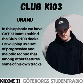 In this episode Unamu is behind the Club K103 decks. He will play us some smile-inducing techno. Listen to Club K103, Saturdays at 20:00 on 103,1 MHz or https://k103.se/webbradio.